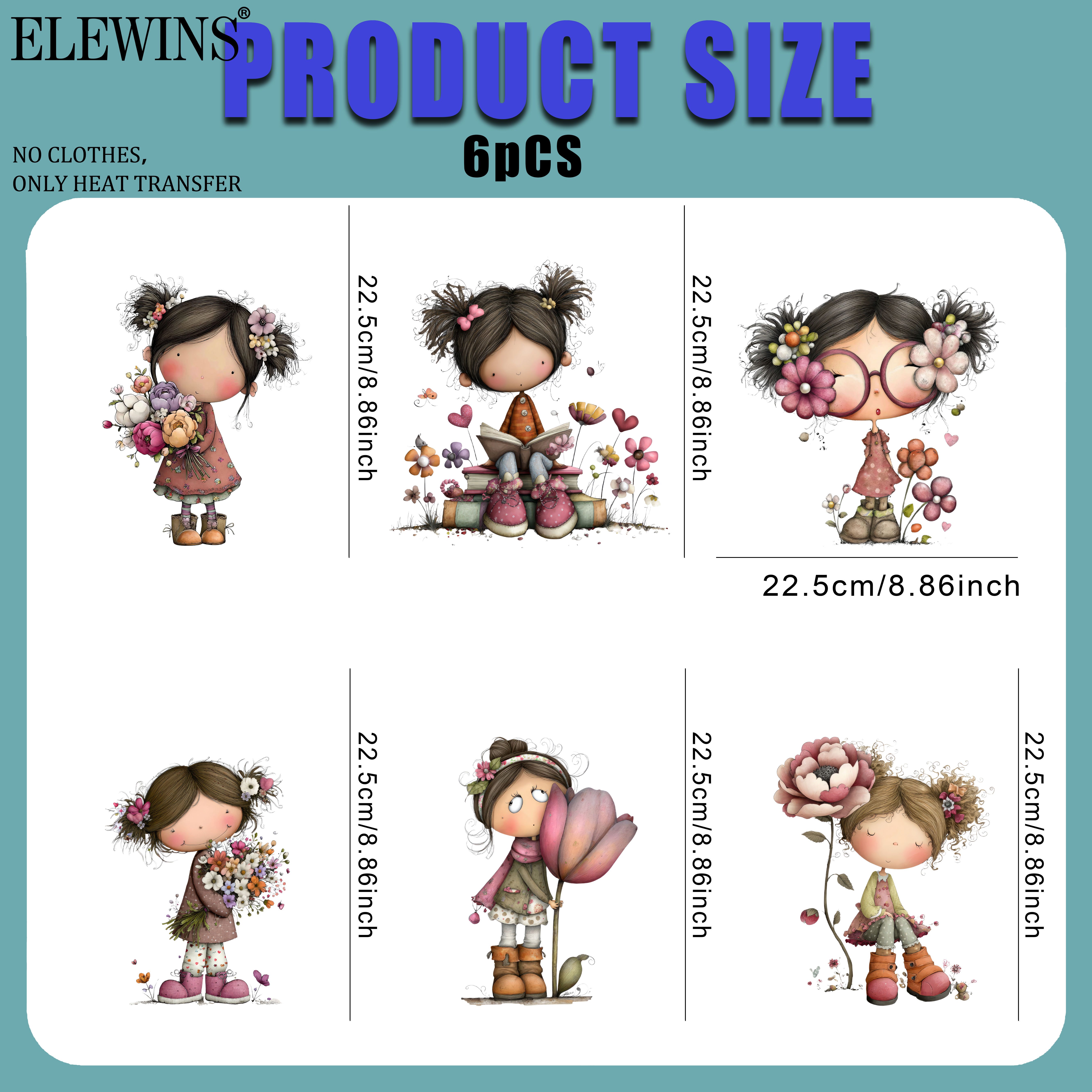 TEMU 6장 귀여운 수채화 소녀 DTF 전사 | 티셔츠, 후드티, 청바지, 백팩 & 베개용 다리미 온 전사 용지, 세탁기 사용 가능한 플라스틱 | 남녀 모두에게 적합, 브랜드: ELEWINS