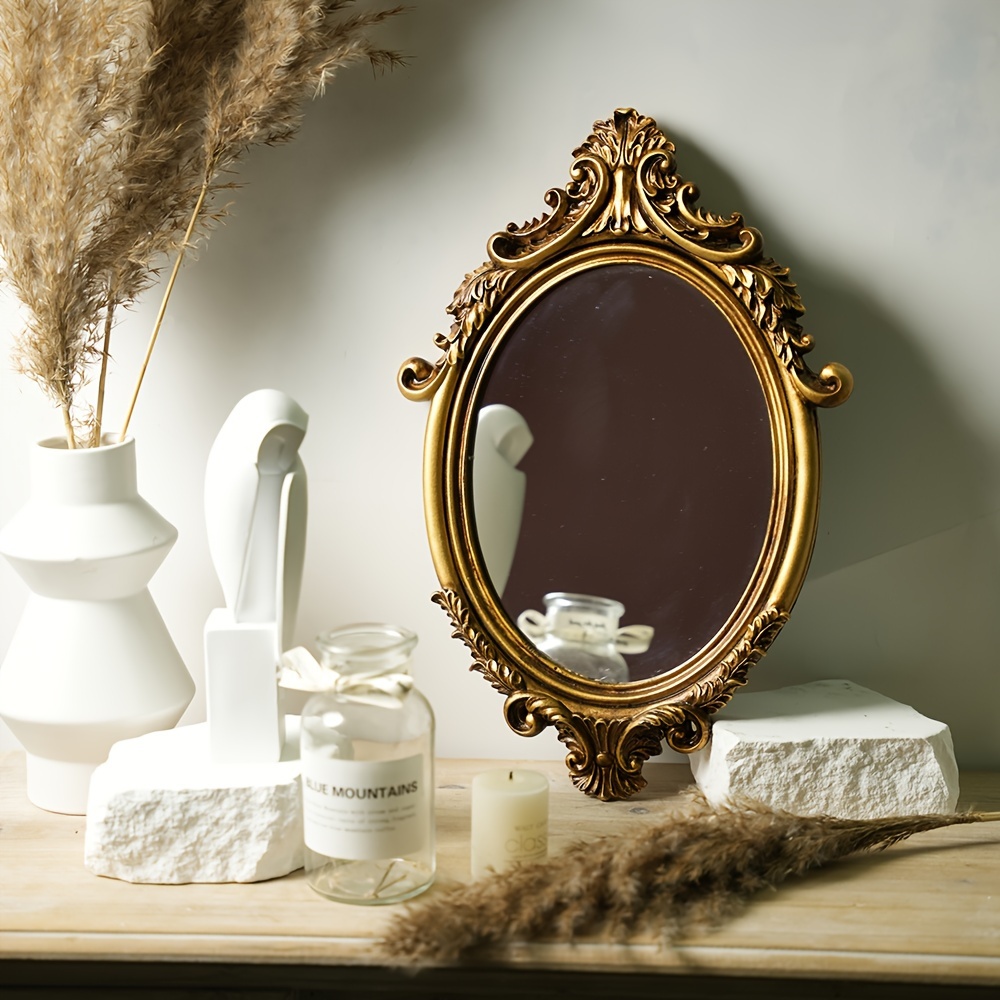 TEMU 유럽 스타일 클래식 금색 패턴 장식 거울. 테이블에 걸거나 놓을 수 있으며, 가정용 벽 장식 또는 화장대 거울로 적합합니다.