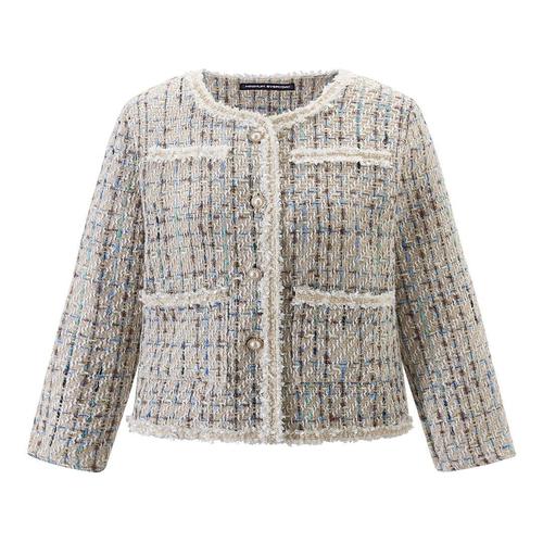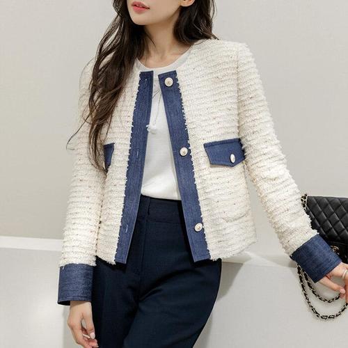 [스타일온미][스타일온미] 세리브 데님 배색 울 블렌딩 펄 믹스 프린지 트위드 노카라 자켓