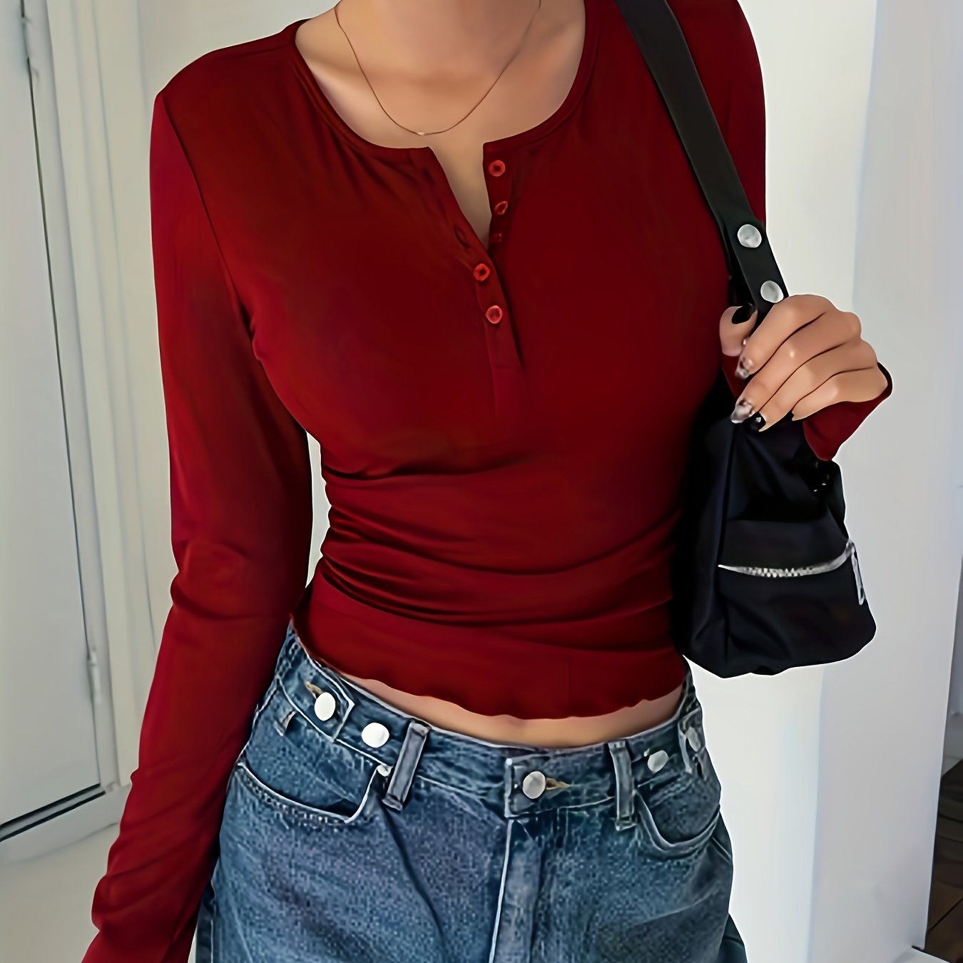 TEMU 여성 버건디 긴팔 라운드넥 티셔츠 - 우아한 특별 컬렉션 단색 버튼업 상의