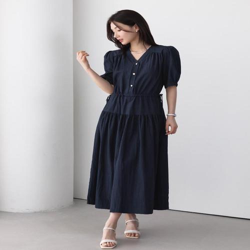[WPBG]브이넥 허리 스트링 플레어 맥시 롱 원피스_2color