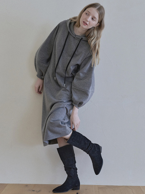 [아방] 볼륨 소매 롱 후드 원피스 - 챠콜 (기모)