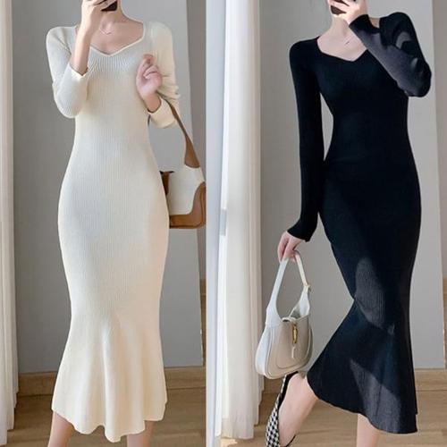 COSYEVNO 여성 니트 원피스 가을 스퀘어 칼라 허리 슬림 머메이드 롱스커트 lyjlyq-1