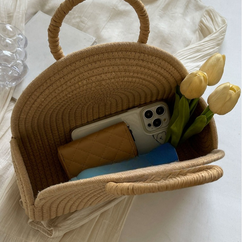 TEMU 해변 바캉스 토트백, 카키색 대용량 우븐 가방, 하프형 여름 해변 핸드백, 여성 캐주얼 크로스바디 휴가 필수품