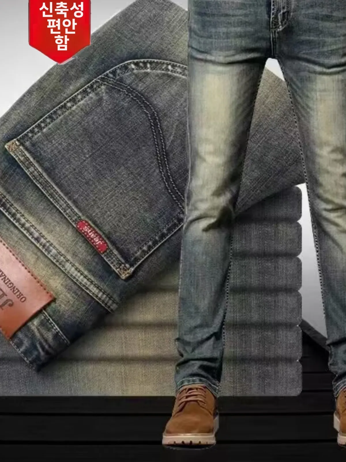 하이엔드 레트로 남성 슬림핏 스트레이트 레그 신축성 있는 패셔너블한 청바지 봄 가을 롱 팬츠 코튼 스트레치 데님 미드 웨이스트 지퍼 캐주얼웨어