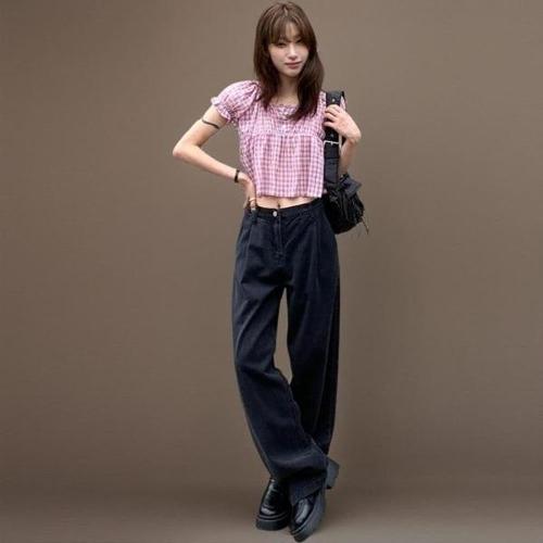 [신상오픈런]여성 체크무늬 프릴 반팔 크롭 블라우스 코튼