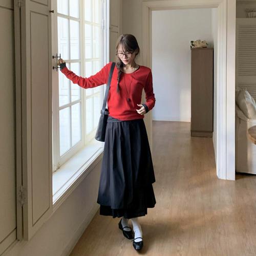 |KMK1A0F|여성용 사계절 코튼 레이어드 롱스커트 봄가을 데일리 스타일