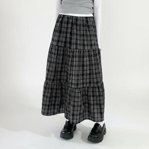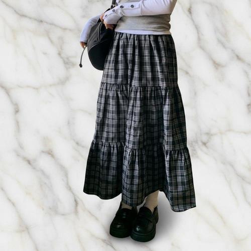 [신상오픈런]여성용 사계절 코튼 체크 롱스커트 티어드 스타일