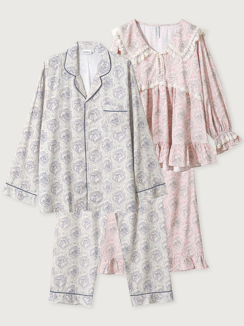 [루나루즈 스튜디오] 커플 쟈르뎅 모달코튼 브이넥 긴소매 투피스 잠옷