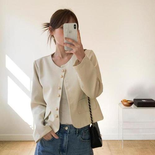 [셀러허브_여성트랜드패션]여자 하객룩 데이트룩 노카라 금장 크롭 자켓