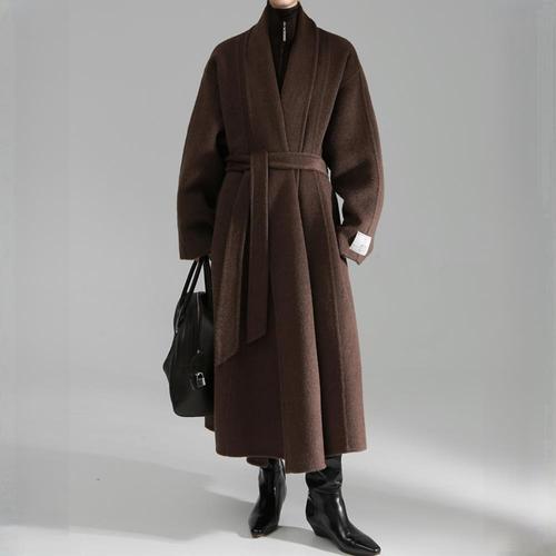 [옷자락] 여성 클래식 무지 울혼방 허리스트랩 모직 롱 코트