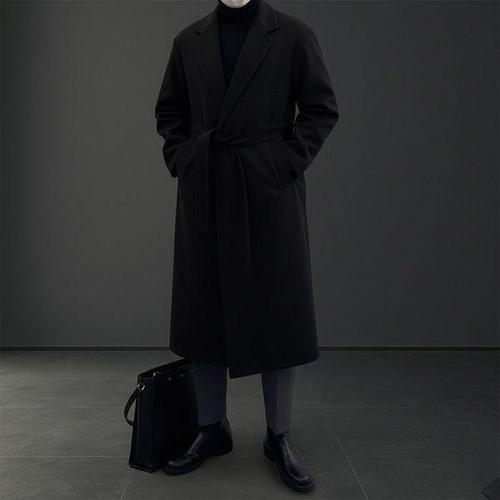 [옷자락]여성 클래식 무지 울혼방 허리스트랩 모직 롱 코트