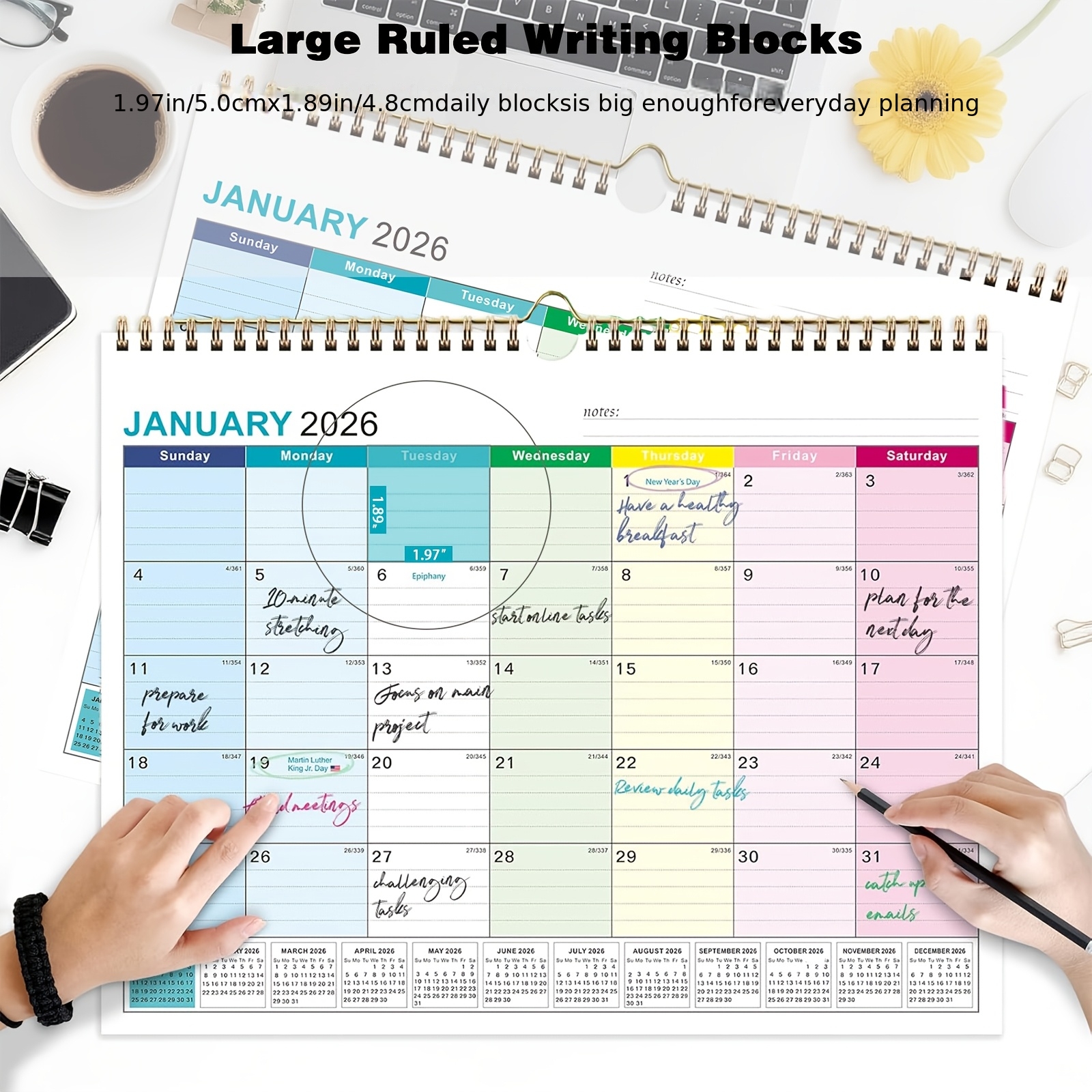 TEMU 2026년 1월 - 2027년 6월 크로스 연도 벽걸이 달력, 18개월. 7가지 색상 블록과 대형 그리드 날짜 디자인, 120gsm 필기 용지 인쇄, 더블 와이어 바인딩. 각 페이지에 연간 월별 프리뷰 포함, 가정 또는 사무실 사용에 적합, 업무와 생활 일정을 더욱 체계적으로 관리