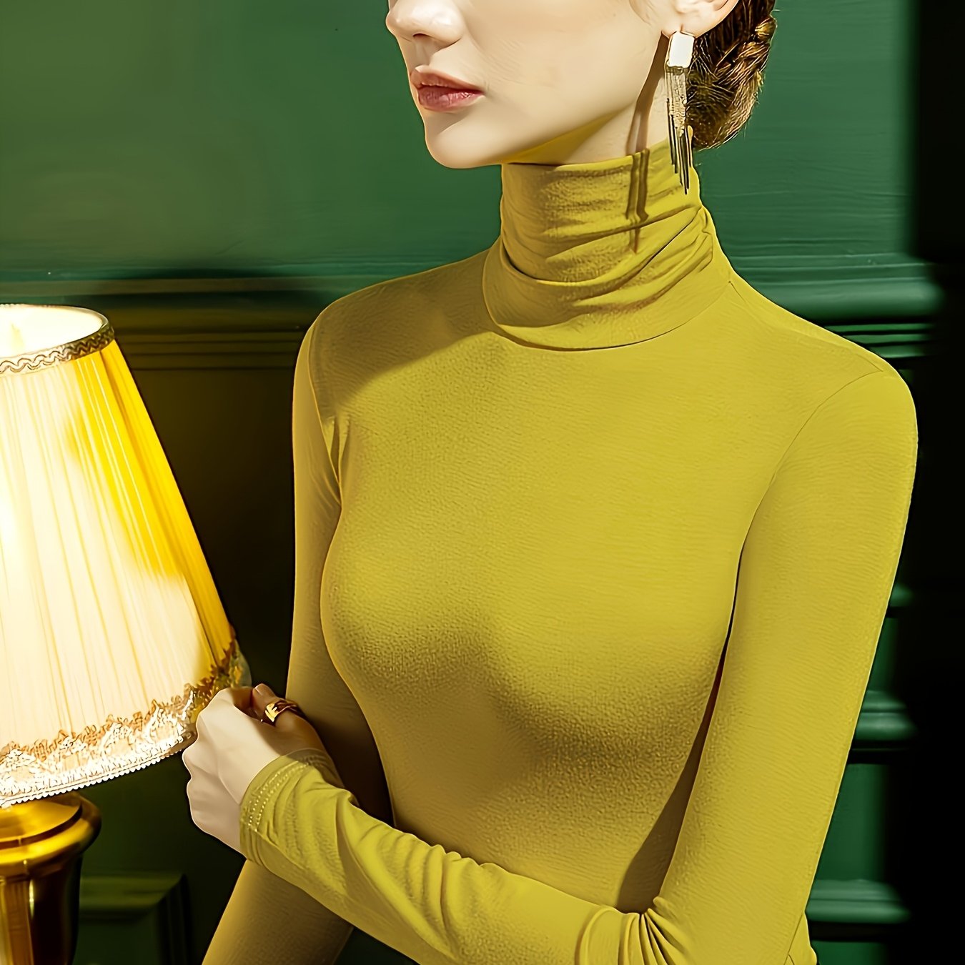 TEMU 여성용 우아한 하이넥 긴팔, 섹시한 솔리드 컬러 슬림핏 긴팔 티셔츠