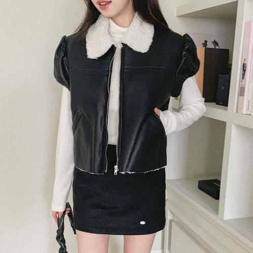 [옷자락] 여성 퍼프 소매 포인트 레더 무스탕 베스트 조끼
