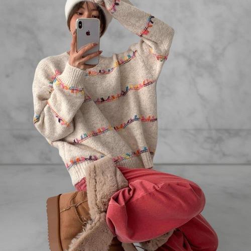 [다잇템]여성 빅사이즈 FW 무지개 라운드 단가라 니트
