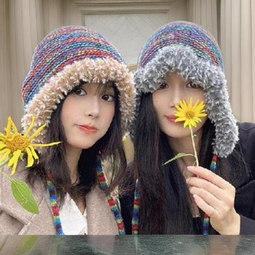 [에이치플러스몰]여성 니트모자 퍼 귀달이모자 겨울 무지개 털모자 벙거지모자