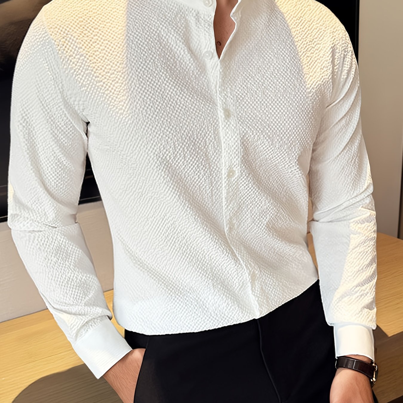 TEMU 남성용 빈티지 스탠드 칼라 시어커커 체크 긴팔 캐주얼 셔츠