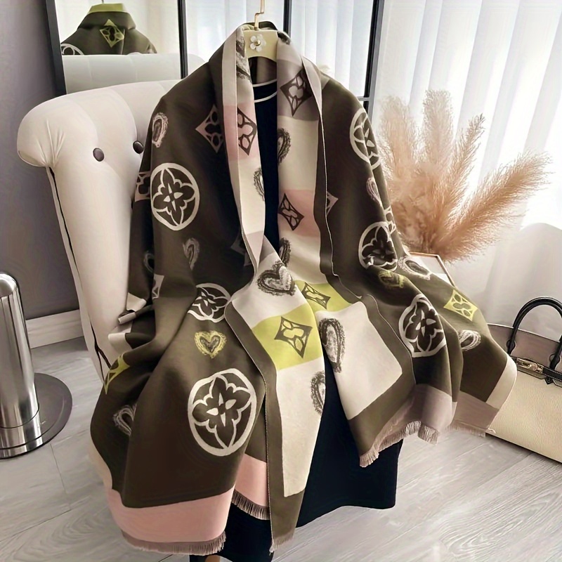 TEMU 시크한 기하학적 하트 & 패턴 스카프 - 여성용 따뜻하고 포근한 폴리에스테르 숄, 태슬 트림 | 가을/겨울에 완벽함