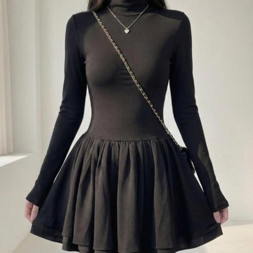 [미라클세븐]여성 폴라넥 컬러배색 슬림핏 긴팔 미니 드레스