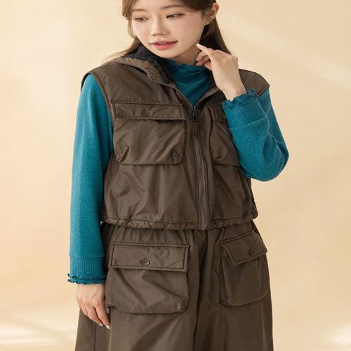 벅시루 여성 1온스 누빔 트윈 볼륨포켓 하이넥 여자 미시옷 겨울 조끼