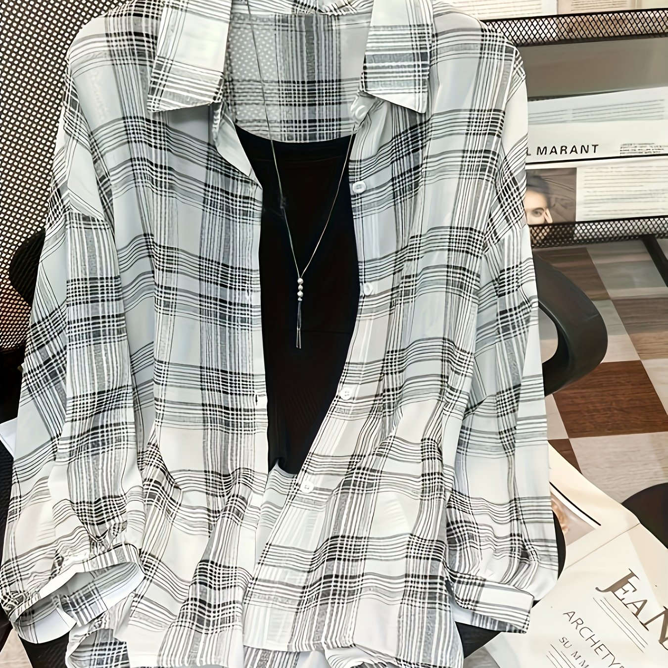 TEMU 플러스 사이즈 - 플러스 사이즈 - 우아한 플러스 사이즈 체크무늬 여성 반팔 셔츠 | 신축성 없는 원단, 라펠 칼라, 버튼 디테일, 여름 컬렉션