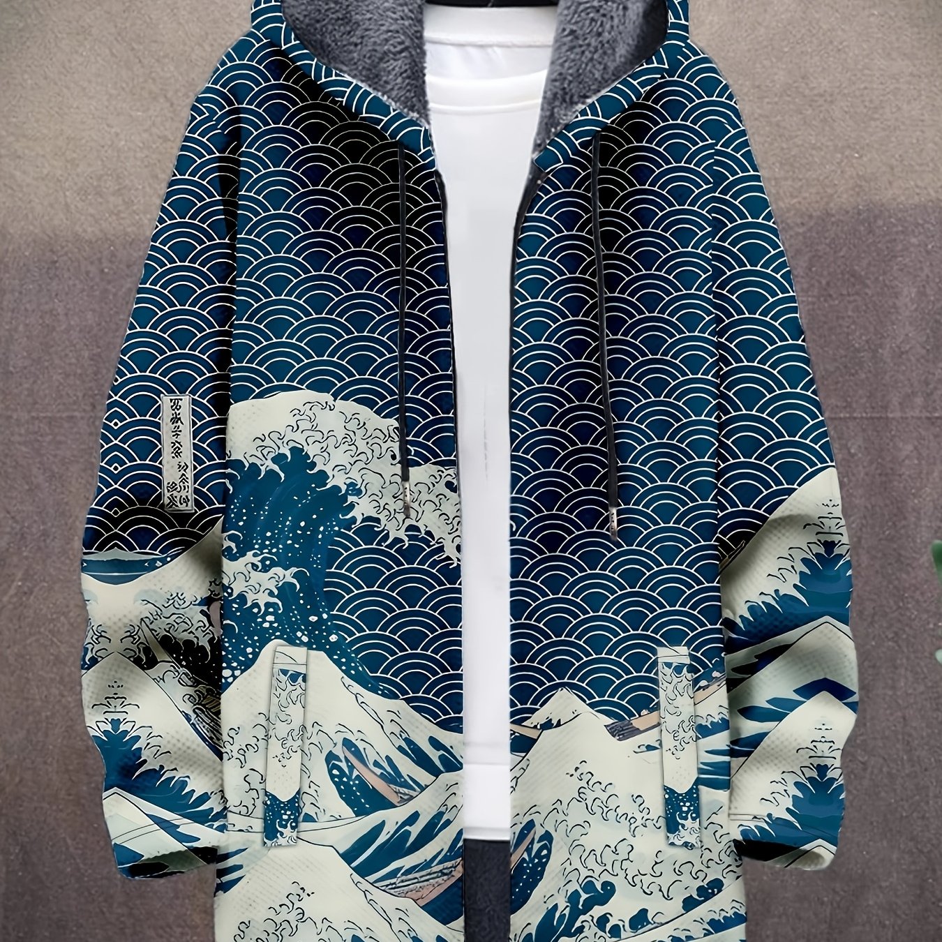 TEMU 빈티지 일본 미술 웨이브 패턴 3D 프린트 패션 남성 플러시 카디건 코트 두꺼운 겨울 캐주얼 따뜻한 지퍼 후드 자켓