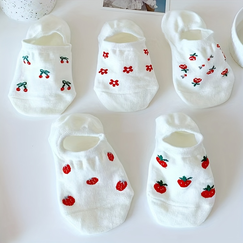 TEMU 여성용 귀여운 체리 딸기 과일 꽃무늬 패션 보트 양말 5켤레 세트
