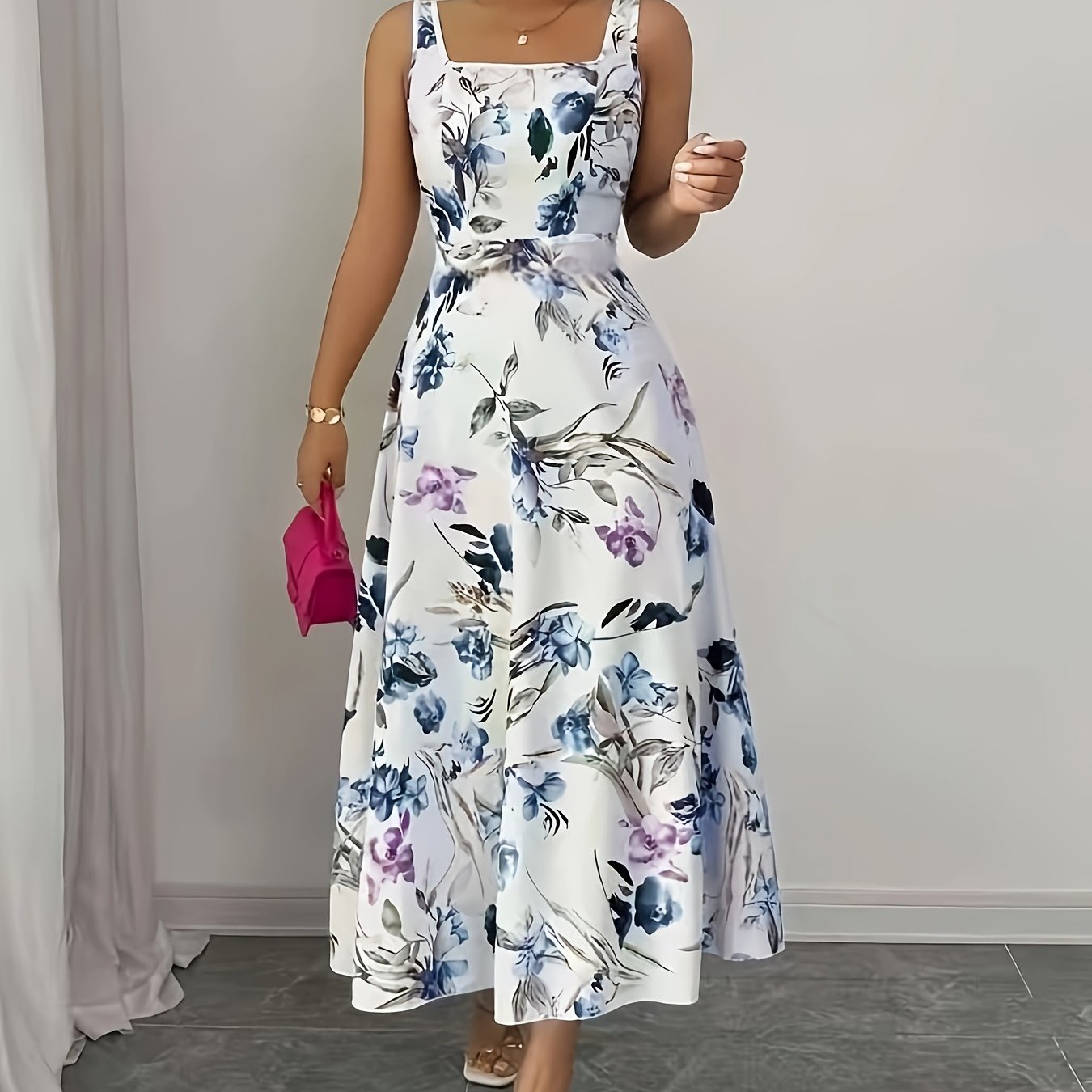 TEMU 여름철 휴가, 파티, 그리고 일상복으로 완벽한 우아한 플로럴 프린트 민소매 A라인 롱 드레스