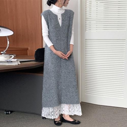 [릴룸]밑단 레이스 브이넥 니트 원피스