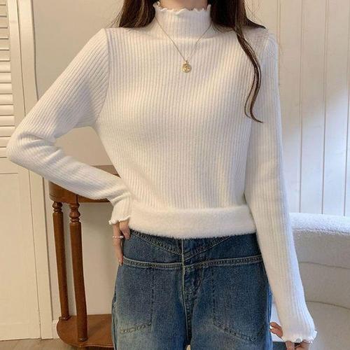 [에이치플러스몰]넥 소매 밑단 프릴 융기모 안감 반폴라 골지패턴 니트