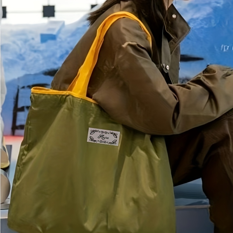 TEMU 대용량 프린트 숄더백, 여성용 접이식 나일론 토트백, 고정 숄더 스트랩, 안감 없음, 지퍼 없음 디자인, 손목 스트랩 포함.