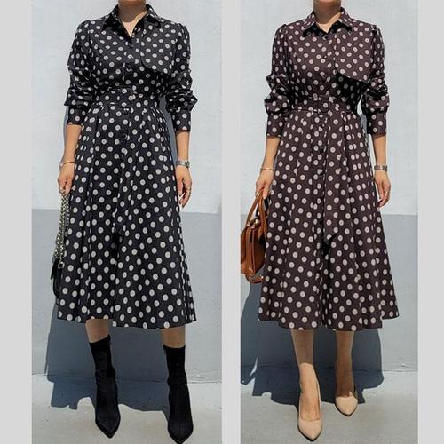 [바이어스]카라넥 도트 트렌치 바바리 벨트 세트 플레어 원피스 (18278708A)