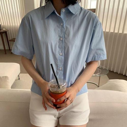 [옷자락]여자 크롭셔츠 바이올렛 하늘색 뒷버튼 반팔 면 셔츠