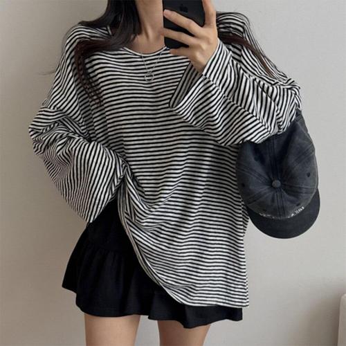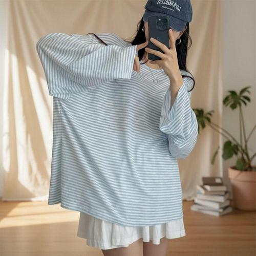 [다잇템][다잇템] 여자 박스 아방핏 힙커버 롱슬리브 단가라 얇은 티셔츠_24637681_588872