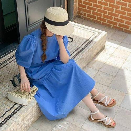 피노사 라운드넥 소매 반팔 퍼프 셔링 니트 원피스 (숏/롱2ver)