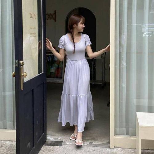 [에이치플러스몰]라운드넥 반팔 셔츠 휴양지 여름 롱니트 원피스