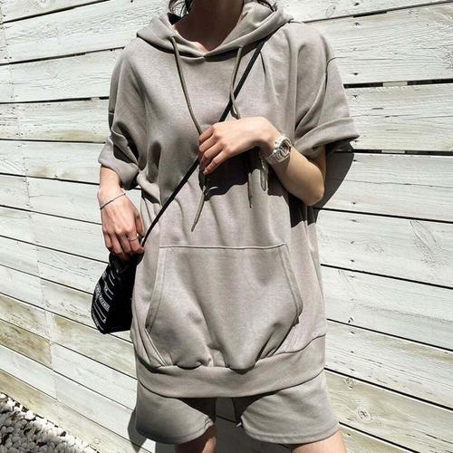 [셀럽하우스]포켓 FIOS4479 심플 셋업 코디세트 루즈핏 반팔 후드 여자