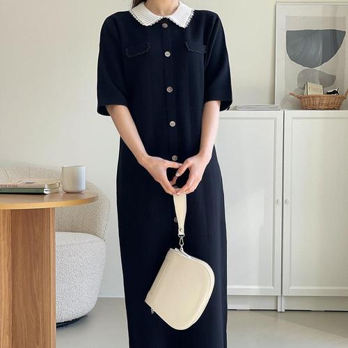 플러리싱 / 레이스 배색 카라 반팔 버튼 니트 롱원피스 플러리싱