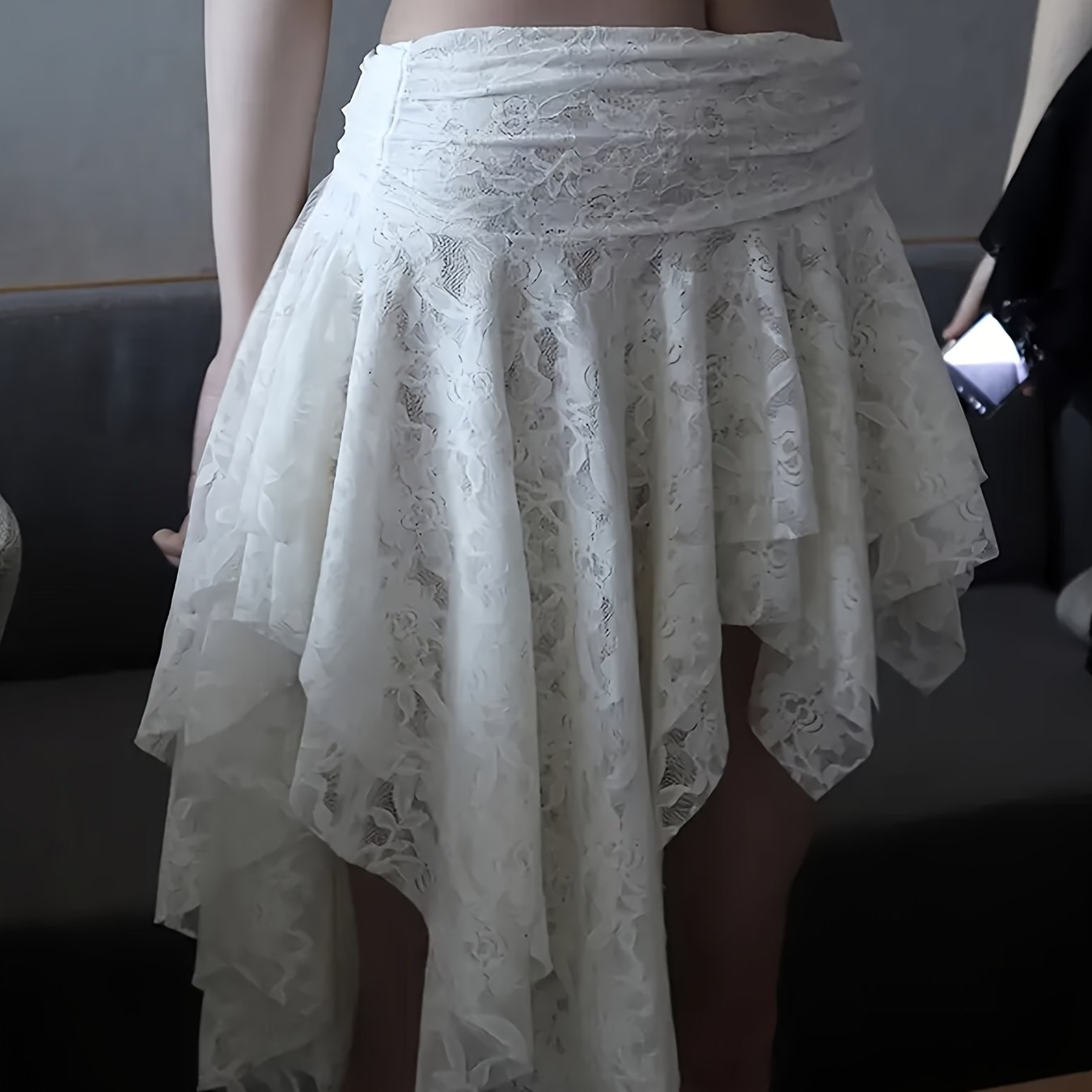 TEMU Y2K 스타일 여성용 단색 레이스 원피스 - 비대칭 밑단, 넓은 허리밴드 크롭 여름 원피스, 데일리 출퇴근/홈웨어용, 통기성 폴리에스터 섬유, 우아한 꽃무늬, 벨트 없음, 레이어드 아이템으로 활용 가능, 세탁기 사용 가능, 편안함, 활용도 높음, 신축성 있음, 추천 여름 필수템 - Niannian