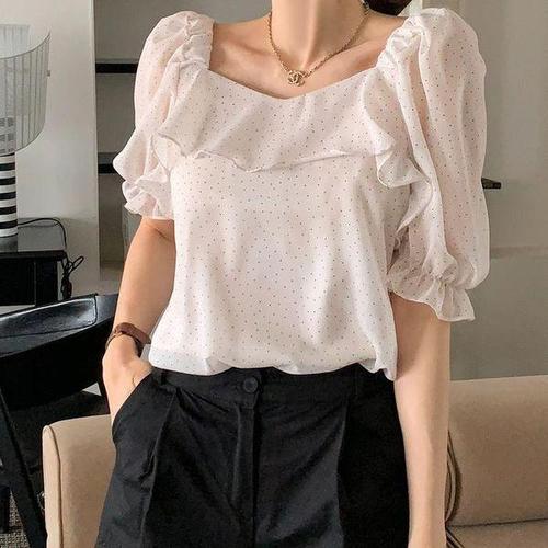 COSYEVNO 여성 상의 도트 프릴 캐쥬얼 페미닌 벌룬소매 CXJn-09
