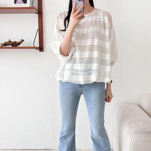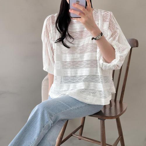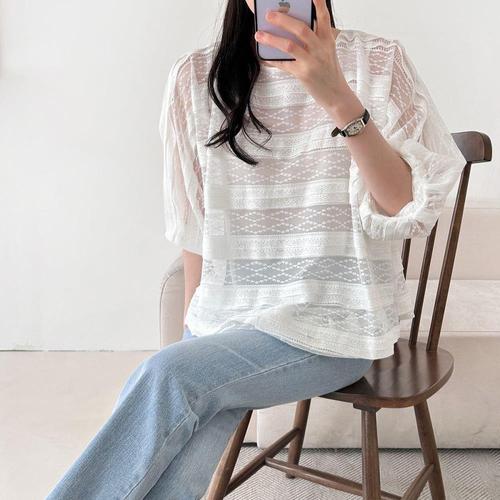 [옷자락] 여성 여름시스루 패턴 5부 벌룬소매 블라우스