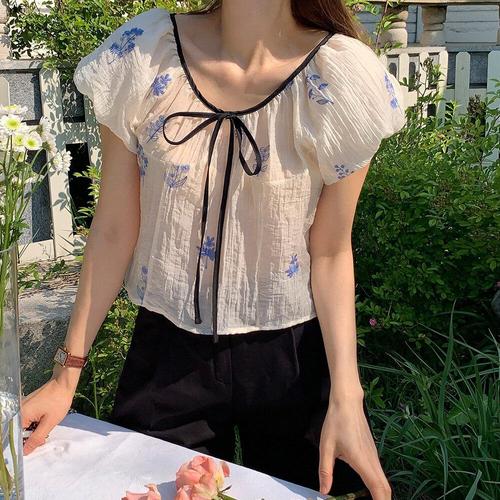 [옷자락]여자 자수 시스루 셔링 벌룬 배색리본 크롭 블라우스