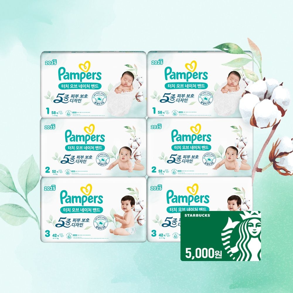 [오늘의딜]팸퍼스 2025 터치오브네이처 밴드형 기저귀 1~3단계 6팩 (총 2박스)+스타벅