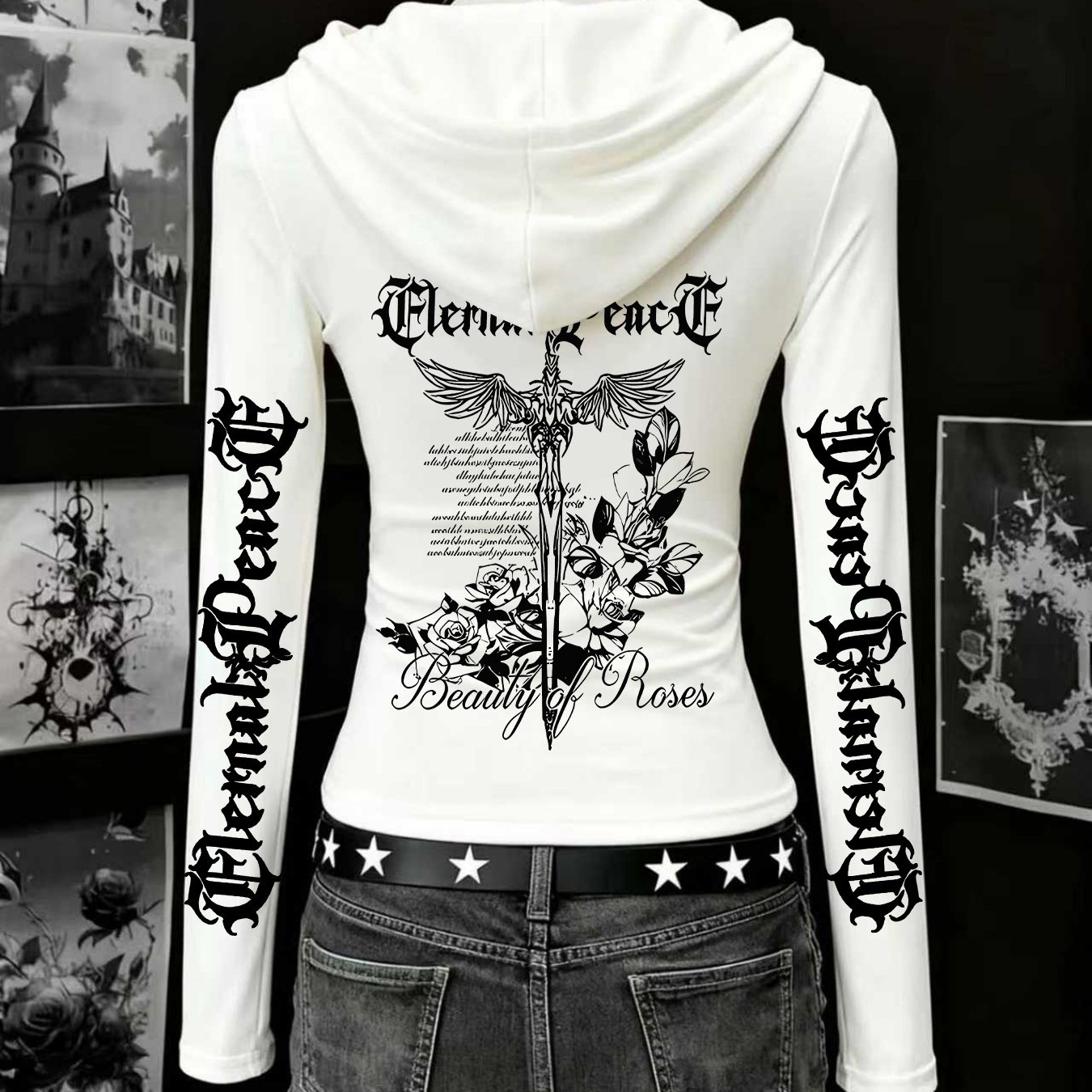 TEMU 고딕 로즈 후드 슬림핏 여성용 탑, 뒷면 성검 로즈 + 플로랄 스크립트 프린트, 니치 문학적 다크 스타일 탑. 빈티지 서브컬처 데일리 웨어, 데이트/커피숍 아웃핏. 정교한 디테일 하이엔드 피스, 봄, 여름, 가을에 적합. 디테일 애호가와 다크 고딕 스타일 애호가를 위한 필수 아이템!