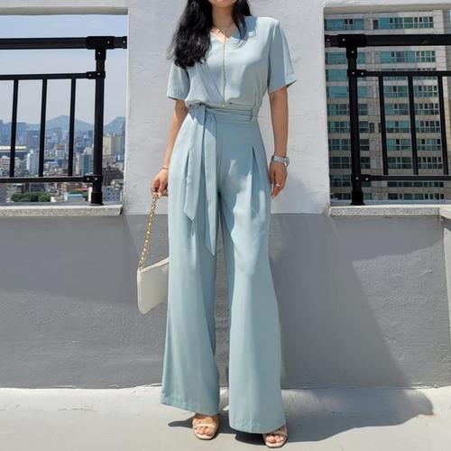 [바이어스]벨트 반팔 브이 블라우스 밴딩 와이드 슬랙스 세트 룩 (15947852A)