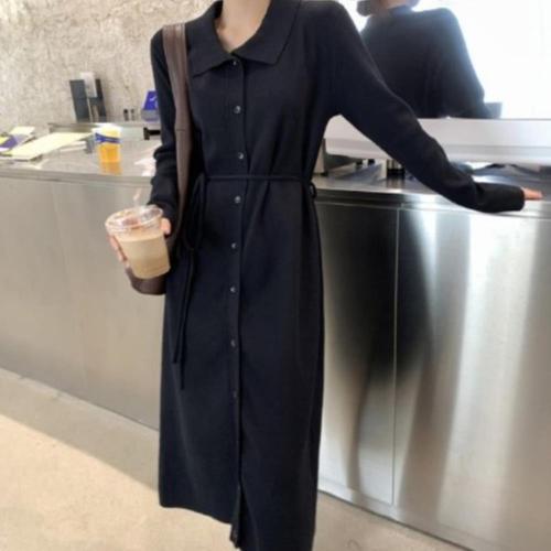 [옷자락]여성 셔츠카라 벨트 포인트 편안한핏 니트 드레스