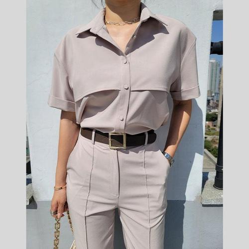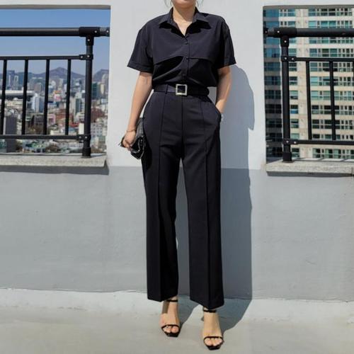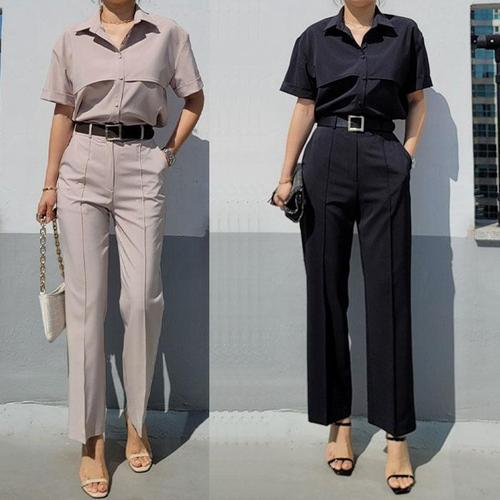 [바이어스]반팔 블라우스 슬랙스 벨트 세트 스판 투피스 코디 룩 (14671978A)