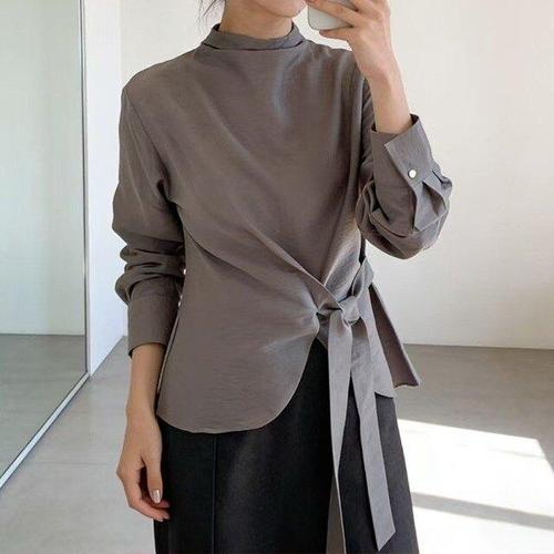 [핑크엘리제]스탠드칼라 허리벨트포인트 휴스넬블라우스