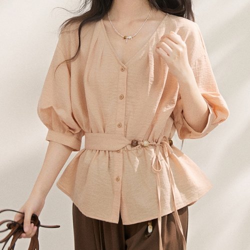 (MADE/프리미엄모달/벨트set) 리에르 벌룬 소매 셔링 벨트 블라우스 bs8592